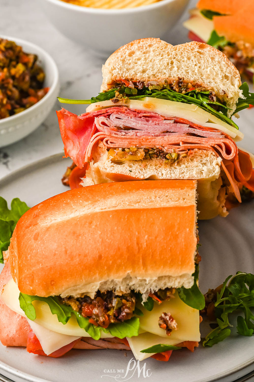 A Classic New Orleans Muffuletta Sandwich Recipe is the quintessential New Orleans Sandwich. Stacked tall with hearty meat and cheese, I top it with a salty olive salad. It’s the perfect sandwich for a crowd of hungry football fans!