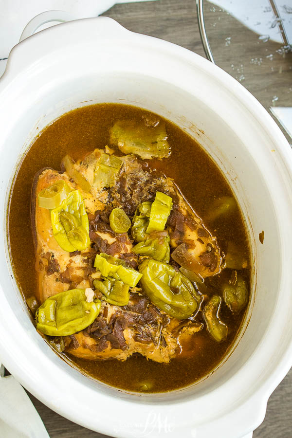 - Pepperoncini peppers. Sliced or whole. I prefer sliced, they’re easier to eat. I also add 1/3 cup of pepperoncini brine.