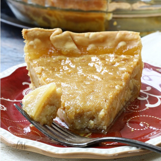 A classic, my pecan pie of is made of pecans mixed with eggs, butter, and sugar. The pecans float to the top leaving the eggs, butter, and sugar to make a gooey, caramel nougat mixture between the pecans and pie crust.